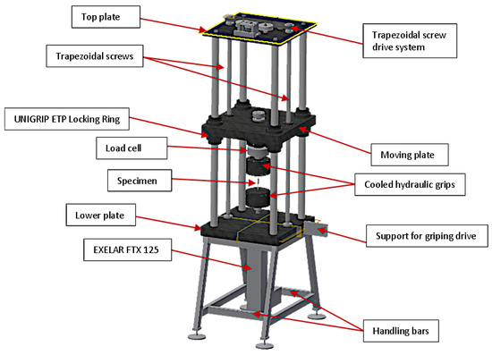 A fatigue machine was designed by developing a complete, high-fidelity virtual model with Computer-Aided Design software. The device was developed to conduct tests with a maximum load of 50 kN at a maximum frequency of 10 Hz. The main frame is characterized by three plates. Below the bottom plate, there is a commercial inverted roller screw jack that applies cyclic load, while on the opposite side, there are four smooth columns and two trapezoidal screws. The selected linear actuator offers several advantages over other solutions, such as a reduced pitch, the ability to apply high loads (15× that of ball screws), minimal clearance between the screw and nut, and long component lifetimes (2× that of ball screws). However, these technological advantages come at a higher cost of approximately 10× that of a ball screw jack with the same load capacity. The columns are locked at the top by a plate, on which a synchronous belt system is mounted to drive the moving plate through the trapezoidal screws. The load cell and the other specimen grip are installed on the moving plate. To increase stiffness, during the tests, the moving plate is constrained on the four columns through hydraulic bushes that enable the preloading of the moving plate with a maximum load of 80 kN.