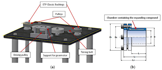 The machine comprises three plates: a bottom plate, a top plate, and a moving plate. The latter is driven by two trapezoidal screws, which are powered by a gear motor via a synchronous belt drive system. The pulleys are attached to the trapezoidal screws using ETP Classic 24 locking bushings, as shown in Figure 6b. The use of these bushings is crucial for several reasons: