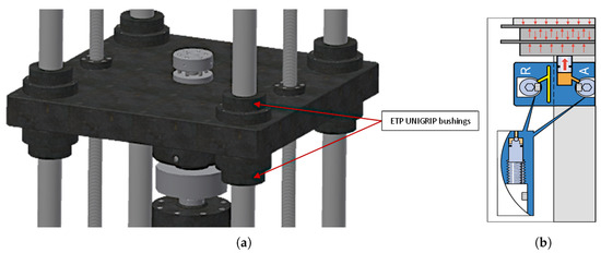 Details of the system for moving the middle plate: (a) Details of the moving plate drive system. (b) Drawing of the ETP Classic bushing.