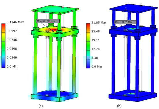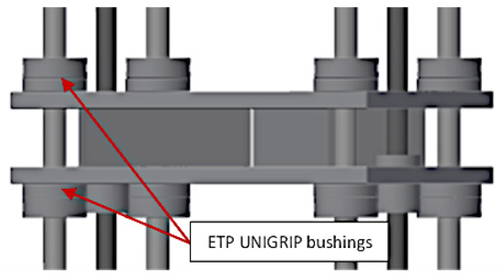 The moving plate is kept in place by four linear recirculating roller bearings from SKF, which are positioned inside the four holes made on the plate to allow the columns to pass through. These bearings are essential to prevent the plate from snagging on the columns and causing damage to the fixed and moving parts. After being positioned at the correct distance from the bottom plate, the moving plate is locked in place using eight UNIGRIP ETP bushings arranged on the top and bottom of the plate and for each of the columns, as shown in Figure 7a. These bushings have three axial plungers, as shown in Figure 7b, which allow them to apply an 80 kN preload on the moving plate (20 kN for each), about twice the jack’s maximum load. The ETP UNIGRIP bushings can radially clamp around the column, and their axial plungers can apply a preload on the moving plate, which helps reduce the compliance of the machine. The dimensions of the structural elements were determined through finite element analysis. The system must operate in the linear-elastic regime, but because of the complexity of the geometry and contact elements, a classical design approach would be too coarse. Therefore, several configurations, with different column diameters and thicknesses of the bottom and moving plates, were analyzed. The first solution, used as a reference, had a thickness of 40 mm for both the bottom and moving plates and a column diameter of 60 mm. The second configuration involved increasing the plate thickness from 40 mm to 78 mm and decreasing the column diameter from 60 mm to 40 mm. The third configuration had 78 mm plates and 60 mm diameter columns. The last configuration, as displayed in Figure 8, started with the dimensions analyzed in the second configuration. However, the moving plate consisted of two 25 mm-thick plates spaced 100 mm apart, using two webs aligned along the diagonals of the plates. The dimensions of the most stressed components are summarized in Table 2. For all solutions, plates and structural elements were designed assuming S235JR steel, with yields and ultimate tensile strengths of 235 MPa and 340 MPa, respectively, while the columns, on which various elements, including recirculating ball bearings, run, were made of 304 stainless steel, with yields and ultimate tensile strengths of 215 MPa and 505 MPa, respectively.