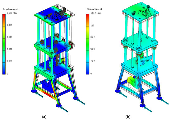 Modal analysis was performed on Solution 3 to determine the natural frequency of resonance by evaluating the first twelve modes. Figure 10 shows in the wireframe view the original shape and the frame’s deformation obtained through the modal analysis for the lowest frequency and for the vibration mode that deforms the frame similarly to the load applied by the jack. Based on the frame deformation shown in Figure 10a, the first mode had a resonance frequency of 9.3 Hz, but this was associated with an external load applied to the base of the frame that bent the device like a cantilever beam. During the tests, the frame was stressed with a load applied in the vertical direction. The mode associated with this deformation is shown in Figure 10b and was characterized by a natural frequency of 106.7 Hz. This large value is related to the greater axial stiffness compared to the flexural stiffness of the designed machine. Therefore, no adjustments are needed to avoid resonance phenomena.