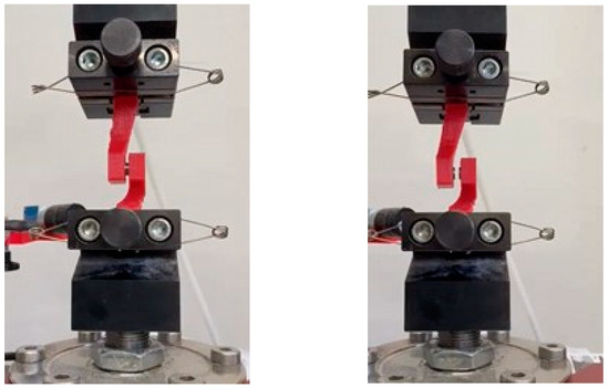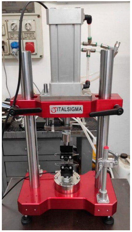 The testing machine, shown in Figure 2, used for the experimental tests is the rapid testing machine (RTM), a static tensile and fatigue machine patented by KnoWow. It is equipped with a 2.5 kN load cell on the lower constraint and allows tests to be carried out with a frequency of up to 15 Hz. It is operated pneumatically, and this, together with its small size, makes it easy to handle and transportable.