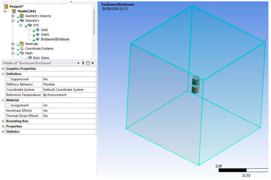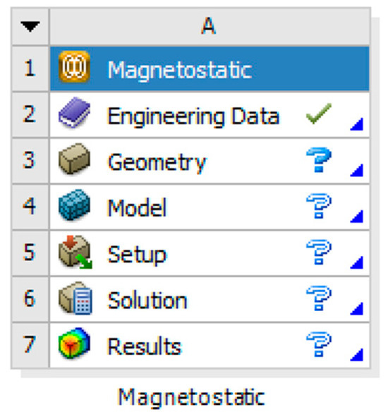 To validate the experimental tests, an FE model was also created that replicated the test using the Ansys “Magnetostatic” module (Figure 5). The Ansys version is 2024R1.