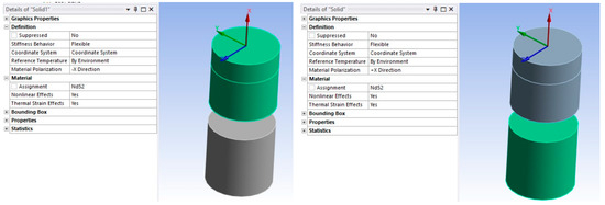 The magnets were polarized in the axial direction, and, depending on whether the test was with magnates in attraction or repulsion, the direction was the same or opposite. Figure 7 and Figure 8 show some screenshots of the setting.