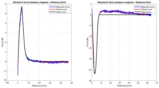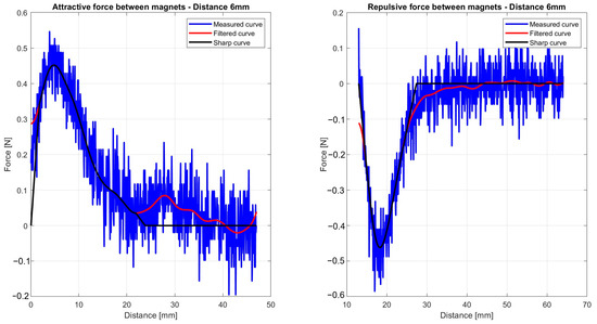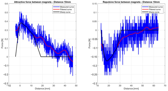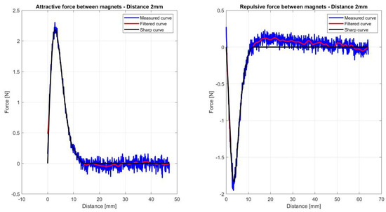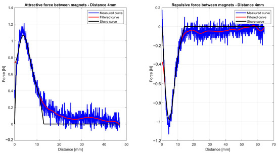 It is also observed that starting from a distance between the faces of the magnates of 6 mm, the force exchanged between them remains approximately constant as a peak value (about 0.4 N) and can be considered negligible. The noise recorded by the machine during the measurements, in fact, could prevail over the actual force exchanged between the magnets. In the following graphs, the curve net of noise is indicated by the “net curve”. The “filtered curve” was obtained with the “butter” function of MATLAB (version R2021b).