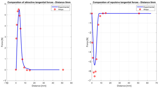 To validate the experimental results, a finite element analysis (FEA) was also conducted. Experimental measurements and FEA simulations produced have curves that start at 0 N when the magnets are aligned, with the force rapidly increasing to a peak a few millimeters away, then decreasing and flattening to zero values. The near-perfect alignment between experimental results and simulations validated the method, confirming its reliability for future design applications.