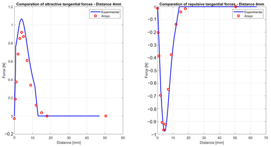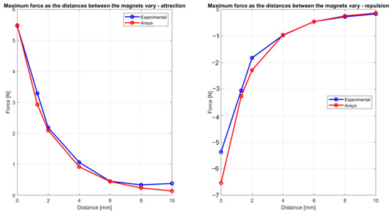 The small discrepancies between the experimental results and the simulation results, which can be noticed especially when the distance between the faces of the magnets is large, are attributable to the moments that are created during the experimental test. The force that the magnets exchange, in fact, could be thought, with a good approximation, to be directed along the line joining the two centers of the cylinders. When the two magnets are spaced transversally, this force can be broken down into two components: a component directed along the axes of the cylinders, which attracts or repels the magnets, without however creating any moment; and a transverse component which instead creates a moment. This moment, acting on the magnets, deforms the plastic supports, bringing the magnets closer or further apart, and therefore slightly varying the distance between them, and consequently, the force. It should be highlighted that this study is preliminary, and the creation of rigid plastic supports is, in the first instance, an economic choice. This problem could be solved by building supports for the magnets in non-magnetic metallic material (for example aluminum) in such a way as not to deform under the effect of these couples.