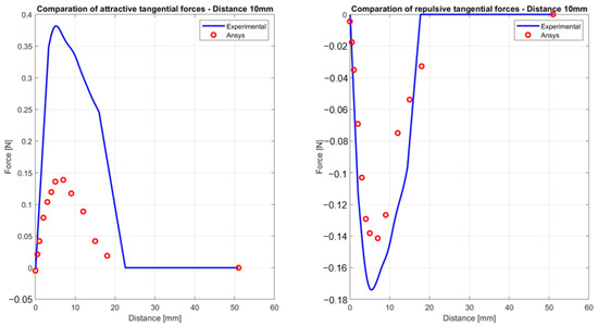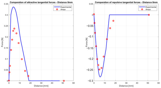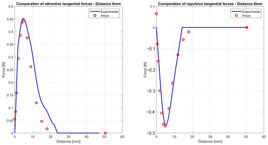 The results obtained experimentally and those obtained via FEA simulation, reported below, coincide almost perfectly, as we can observe in Figure 15, Figure 16, Figure 17, Figure 18, Figure 19 and Figure 20. It is also confirmed that, when the distances between the faces are large, the noise prevails over the actual force measured; in fact, in the case of magnets 10 mm apart, the force calculated using the FEM is much lower than the force measured experimentally.