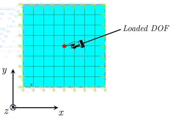 Equation (4) should be interpreted differently from Equation (1), as now the idea is that some components of the vectors and are already known from the experimental tests. To better understand this step, refer to the example in Figure 1, which shows a plate clamped at the edges and loaded at its center perpendicularly to its plane. If this plate is discretized using plate elements, a distinction must be made between the free and constrained degrees of freedom (DOFs). Therefore, the partitioned form of Equation (4) becomes: