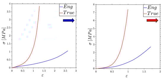 Using Equation (14), it is possible to search for there exists an orthotropic reference system for the obtained results in Table 1, Table 2 and Table 3 (i.e., an angle such that ). This result was achieved in the three cases examined, and the elastic constants in the orthotropic reference system, including its angular orientation with respect to the reference system used for the experimentation (Figure 3a), are reported on the right side of Table 1, Table 2 and Table 3. The values of the elastic constants in the orthotropic reference systems are easier and more intuitive to evaluate. Indeed, from these, it can be seen how the stiffness values and were in accordance with what was measured experimentally through tensile tests (Figure 2). Furthermore, they also adequately reflected the stiffening of the material in the preloaded direction. This is because, as a consequence of homogenization based on the experimental data, stress stiffening influenced the results, and thus the constitutive matrix of the apparent (homogenized) material.