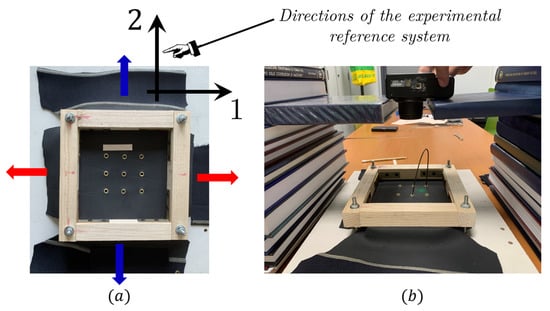 The loading procedure was applied for various preload levels of the membrane. The preload was introduced by applying a strain of 15% or 30% relative to the initial length of the membrane’s side. Specifically, the test cases included 0–30%, 15–30%, and 30–30%, where the first number in the pair indicates the preload along the strong direction (red arrow in Figure 3a), and the second number indicates the preload along the weak direction (blue arrow in Figure 3a).