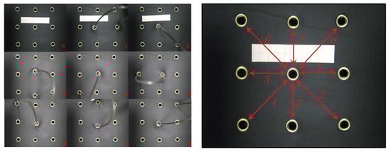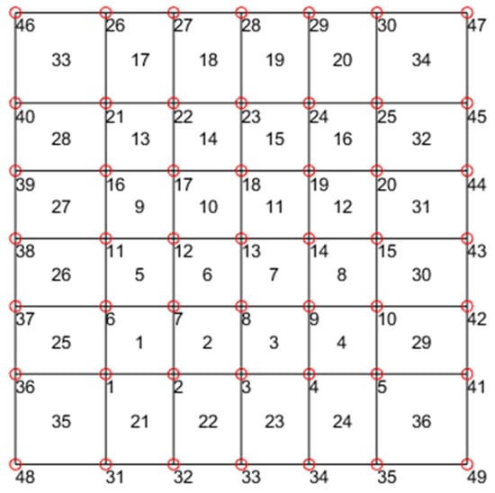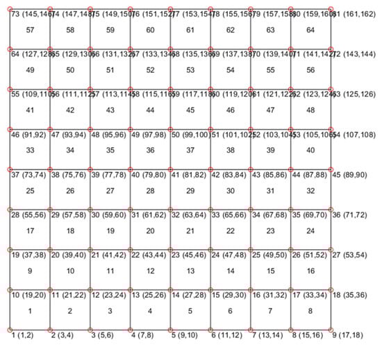 Through digital image acquisition of the deformed configurations, we proceeded to collect the displacements on the loaded DOFs, which were used in Equation (9). The acting forces were determined from the displacements via the elastic constants of the springs shown in Figure 4. The membrane was modeled using four-node plane elements [21], and the mesh utilized in our custom software for data processing is represented in Figure 6. Given the simple geometry of the analyzed membrane, the mesh consisted of 64 geometrically identical elements, allowing for the analytical computation of the stiffness matrix.