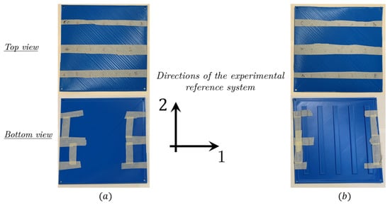 The proposed method’s validity was further assessed for the plate components. For the experimentation, two PLA rectangular plates were fabricated through 3D printing (Figure 7). One of the plates was reinforced by additional material strips to introduce a controlled anisotropy due to the geometry of the component that did not stem from the inherent properties of the material, but from the geometric configuration of the component itself. This intentional “geometric anisotropy” was designed to simulate directional stiffness variations, allowing for a more complex assessment of the proposed numerical procedure’s ability to capture and reflect these structural features within the homogenized elastic matrix.