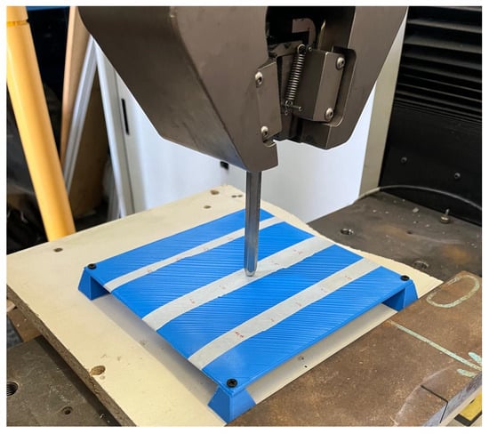 The data required to compute the material’s homogenized matrix were obtained by loading the two plates at the 15 points shown in Figure 7. The plates were clamped at the four corners and subjected to imposed displacements. A compression machine equipped with a load cell was used to apply the displacements and measure the applied loads. The experimental setup is illustrated in Figure 9.