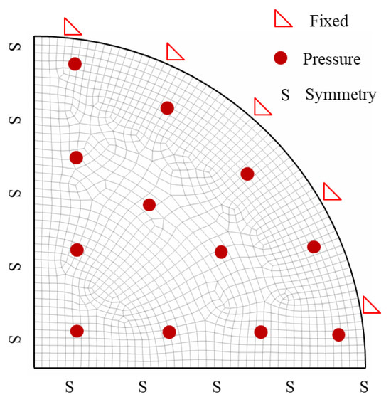 The finite element analysis (FEA) is performed using the model represented in Figure 4. Due to the symmetry of the problem, only one quarter of the window is modeled using 2D Shell 181 4-node elements of the Ansys element library. A free mesh, with global element size d = 0.3 mm, is used, the outer line is fixed, and symmetry boundary conditions are imposed on the radial lines; then, the atmospheric pressure is applied to the surface (p = 0.11 MPa).