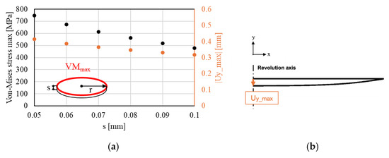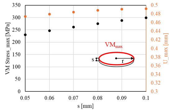 The results, expressed in terms of maximum von Mises stress and maximum out-of-plane displacement, are reported in Figure 5 as a function of the plate thickness “s” in the range between 0.05 and 0.1 mm.