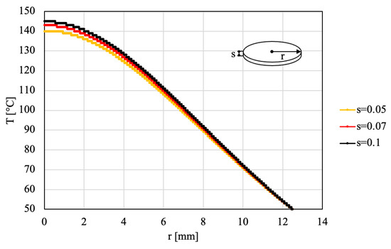 Temperature trend along the radius of the window for thicknesses s = 0.05 mm, s = 0.07 mm, and s = 0.1 mm. The proton beam power used for all these simulations is P = 35W.