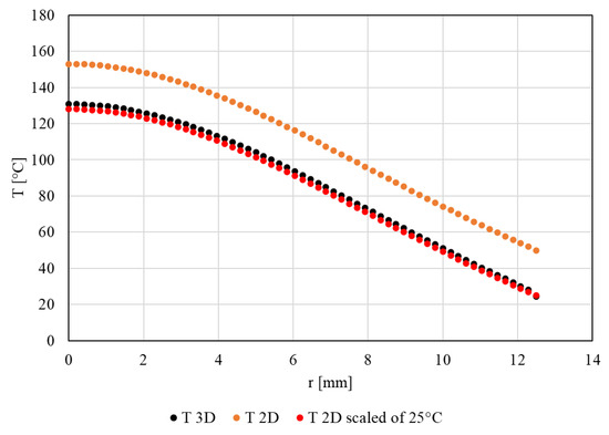 Comparison of the temperature trend along the radius of the window between the simplified 2D model (orange dots indicators), the simplified model scaled using −25 °C (red dots indicators), and the 3D model (black dots indicators).