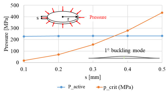 Due to the structure’s slenderness and the compressive nature of the stress field, a buckling analysis is necessary. First, a linear elastic eigenvalue analysis was conducted on the beam window to determine its critical pressure for various thicknesses. This was then compared with the active pressure at the outer diameter, obtained from the thermal–structural analysis described in Section 3.3, conducted for thicknesses between 0.1 mm and 0.5 mm. In particular, the constraint reaction in the radial direction (Fr) was derived from the thermal–structural simulation, and the active pressure was calculated using Equation (2):