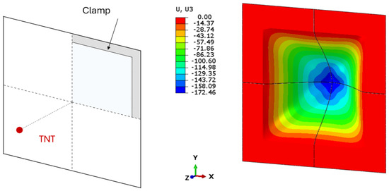 When the explosive detonates, it generates a blast wave, represented as a pressure wave applied to the structure, exerting a force on it. Such extreme loading on the structure may lead to plate rupture, plastic permanent deflection or elastic oscillations. Based on the reference system selected, as shown in Figure 1 (right), the permanent deflection is conventionally considered negative. No experimental validation is pursued in this case because this is out of the scope of this work. Indeed, this case is considered a representative scenario to assess the feasibility of an ROM framework for blast-related problems. In particular, the mass and stand-off distance are chosen to ensure that no plate rupture occurs while producing permanent plastic deformations, even in the least severe case, rather than just elastic oscillation. The software Abaqus Explicit [5] is used to model the blast wave’s effect on the structure with each numerical simulation set to a total time of 20 ms. The elastoplastic behavior of the steel is described using the Johnson–Cook constitutive law [6] reported in Equation (1):