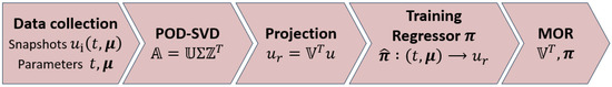 This work’s model order reduction (MOR) technique is classified as non-intrusive because it relies solely on a data-driven approach without requiring any information about the numerical solver used in the full-order model. In addition to constructing the reduced basis, the non-intrusive MOR employs a regression model as a surrogate for querying new solutions. This meta-model approximates the full-order system within the subspace defined by the reduced basis [3,8]. Figure 2 shows the stages in order to define the offline phase of a non-intrusive MOR.