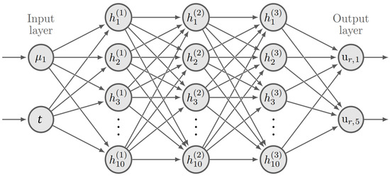 - The previous step allows processing information made available by the FOM. However, to deal with a query of parameters the model has never computed, it is necessary to learn a nonlinear map whose input is the set of parameters t and μ, while the output is the solution represented in the reduced space . The nonlinear mapping can be approximated by a neural network , which learns the nonlinear map relationship between the given input and output as reported in Equation (6):Time t is considered a scalar value included in the interval where T is the ending time of the simulation. On the other hand, μ is a vector belonging to the space of parameters P. The Cartesian product between these two quantities gives origin to all the possible combinations of inside the design space . The neural network aims to learn how to map from these combinations to the corresponding solution in the reduced space. The problem can be defined as a regression problem solved via a supervised learning approach. Figure 3 shows this work’s fully connected deep neural network.