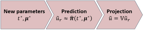 Once the training phase is over, the model can be deployed in the online stage. The dimensionality of the FOM, which was already addressed in the offline stage, no longer leads to the complexity of the computation. In particular, the online phase is structured into a 2-stage workflow. Firstly, the prediction for the new query is performed, and then the projection matrix is applied to reconstruct the solution in the original problem domain. Figure 4 shows the online stage of a non-intrusive ROM.