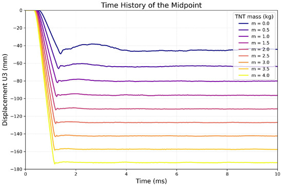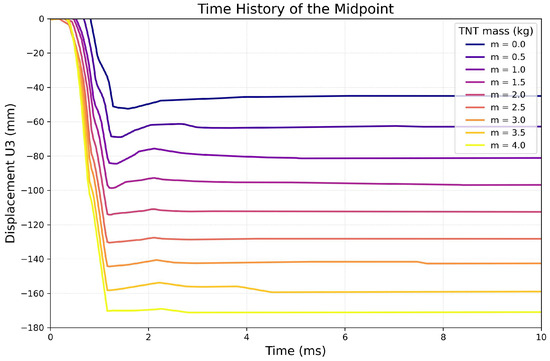 Displacement vs. time of the midpoint for several values of TNT mass for the reduced-order model.