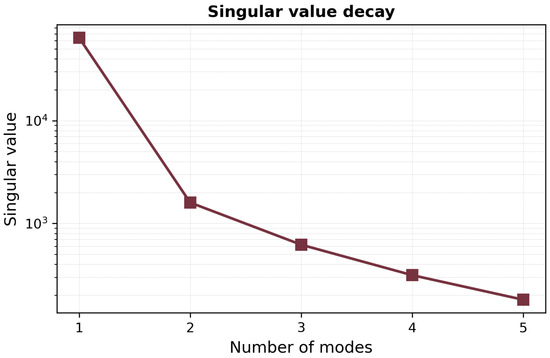 After an initial transient phase where the blast wave interacts with the structure, the dynamic load ceases, leaving only a permanent deflection of the structure. Figure 6 shows the magnitude of the singular values retrieved from the matrix Σ considering the first five modes.
