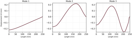 Each of the nth singular values stored in the matrix Σ is associated with a mode, which is the nth column vector of . Figure 7 contains the first three modes, and it is possible to associate them with a physical interpretation for the problem under consideration.