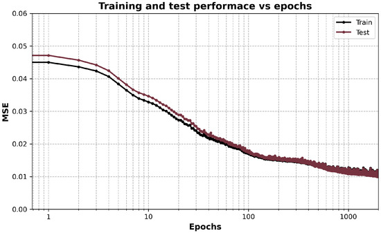 The first mode captures the deformed shape of the plate, while the higher modes are oscillatory ones where the frequency increases by increasing the mode number. The reduced dimensionality can be interpreted as a linear combination of such modes where the first one is responsible for the permanent final deformation multiplied by an adequate scale factor, while the others are responsible for describing the dynamical loading experienced during the transient load of the blast wave. Combining all these reduced bases leads to the reconstruction of the full-order model response with a lower number of DOFs. The snapshot matrix is divided into two subsets for training and testing purposes in a randomized way to promote an efficient learning phase. The training stage is performed over 2000 epochs, and the performance over the training and test sets are reported in Figure 8. The loss function is expressed as the Mean Square Error (MSE); the final values for train and testing, respectively, are equal to 0.01038% and 0.01049%.