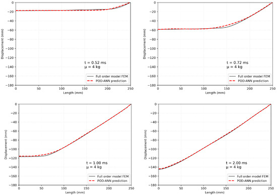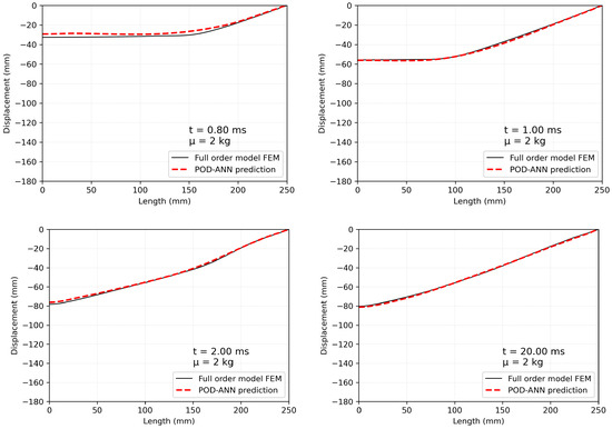 Once the ANN is trained, ROM will be ready to use. Two meaningful cases are considered to show the method’s capability. The mass is 2 kg in the first case, and it is set to 4 kg in the second case. Different time steps in Figure 9 and Figure 10 represent the trend of the displacement field for both the FOM and the ROM with a good agreement. The reduced model can capture both the initial transient where the deformation starts and the final permanent displacement of the plate once the blast load vanishes.