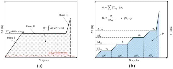 In 1968, Risitano used infrared thermography to assess material fatigue [17]. Later, in 2000, La Rosa and Risitano developed the Thermographic Method to determine the fatigue life of materials [24]. When a material is subjected to cyclic loading beyond its fatigue limit, three distinct temperature evolution phases can be observed (Figure 1a): an initial increase (I), a stabilization phase (II), and a subsequent rise in temperature (III). The higher the applied stress, the greater the stabilization temperature in Phase II; however, the area under the temperature vs. cycle number curve remains constant and corresponds to an energy parameter Φ. By applying different stress levels progressively [23] (Figure 1b), it is possible to determine the stabilization temperature for each stress condition. The fatigue limit is identified at the intersection of the temperature vs. stress curve with the stress axis [24].
