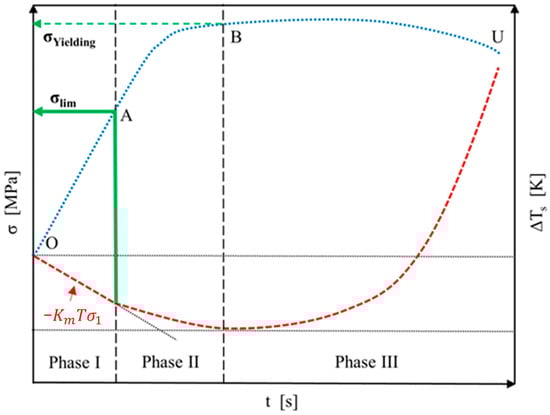Among different rapid fatigue assessment methods, the Static Thermographic Method has shown the possibility of rapidly obtaining the first damage initiation within the material. The STM is related to the variation in the temperature trend that exhibits three different phases during a static tensile test (Figure 2). The first phase (I) is characterized by an initial approximately linear decrease due to the thermoelastic effect described by Lord Kelvin’s law. In the second phase (II), the temperature deviates from the first linear trend until a minimum temperature value is reached. In the last phase (III), the temperature increases rapidly until the material fails (III). Under uniaxial stress state and in adiabatic test conditions, Lord Kelvin’s law can be expressed as Equation (1):