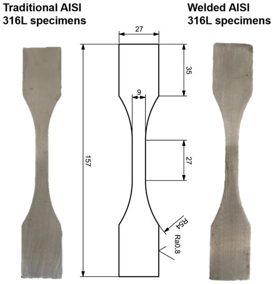To evaluate the fatigue behavior of traditional and welding AISI 316L, static and stepwise tests were performed on two sets of specimens, the “as-received” and the “welded” one (Figure 3). The first set of samples was obtained by laser cutting from a 3 mm thick plate, while the “welded” samples were made via the V-shaped welding of two plates. A full penetration welding without filler material was executed. The welding bead was subsequently flattened. The set of “welded” specimens was also made by laser cutting. Static tensile tests were performed under stress control with a stress rate equal to 6 MPa/s, using a servo-hydraulic loading machine MTS 810 with a maximum load capacity of 250 kN. The stress rate must be adopted to ensure adiabatic conditions during the tensile tests, i.e., the specimen must not have the time to exchange heat with the surrounding environment. During the tests, the specimen surface temperature was monitored using an infrared camera, FLIR A40, to record the temperature evolution every second. For the post-processing of the temperature signal, a rlowess filter was used, with a data span of 5%, to exclude outliers and enhance the linear trend.