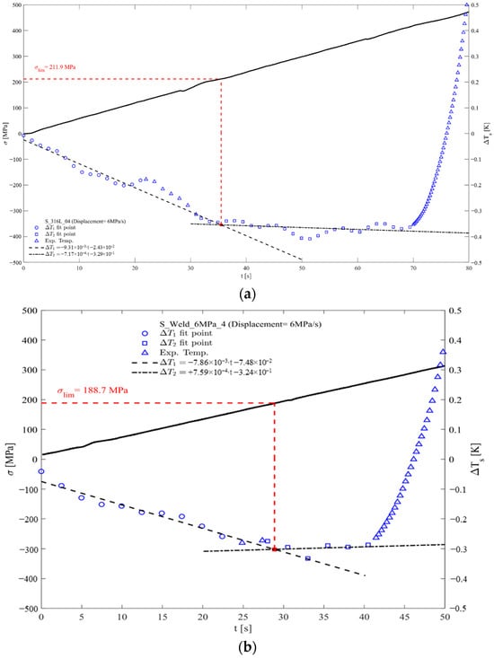 The same procedure was applied to the AISI 316L welded samples (Figure 4b); in this case, monitoring the thermal signal made it possible to clearly distinguish the two different phases, and the average value obtained was σlim = 191 ± 20 MPa.