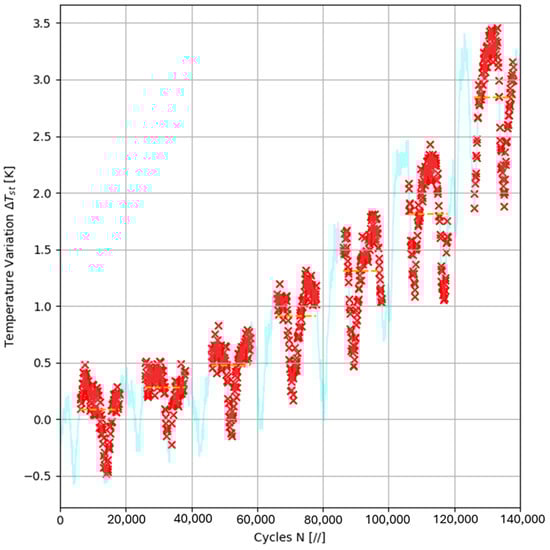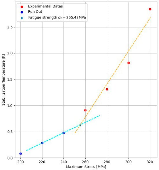 For example, it is possible to plot different stabilization temperatures vs. applied stress levels (Figure 6). It is possible to intersect a straight line with the points related to the stress levels above the presumed fatigue limit, just as it is possible to intersect a straight line with the points related to the stress levels below the fatigue limit. The intersection of the two intersecting lines corresponds to the stress levels at which fatigue damage begins. Therefore, it can be related to the fatigue limit of the material.
