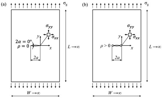 To preserve the simplicity of the analysis, this study focuses on the case of a central crack/notch in an infinite plate subjected to uniaxial stress, σg, with a loading ratio of R = −1 (see Figure 1). The crack is modelled as a sharp notch with a notch root radius ρ = 0 and an opening angle 2α = 0 (see Figure 1a). Among the various methods for arresting a propagating fatigue crack by means of stop-holes [4,5], this work focuses on the simplest approach, which involves drilling a single hole at the crack tip (see Figure 1b).