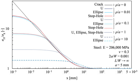 The results are shown in Figure 2, which illustrates how the opening stress component, σyy, varies along the notch bisector x line (see Figure 1). For comparison, Figure 2 also includes the singular stress field of the sharp crack (with ρ = 0), depicted by the continuous black line.