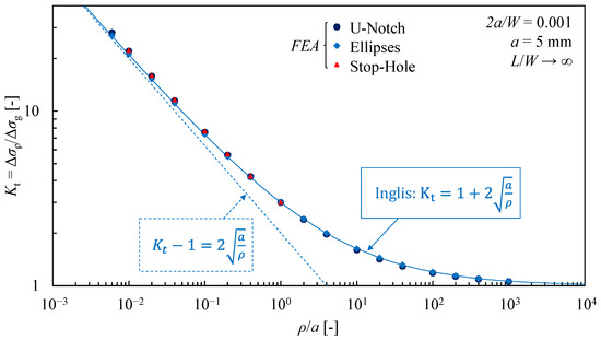 Figure 2 shows that the notch type (stop-hole, U-notch, or elliptical notch—Table 1) has a negligible effect on the opening stress field along the bisector line for a given ρ/a. Nevertheless, slight differences become noticeable when analysing the stress field nearby the elastic peak stress σρ (as x → 0). Specifically, for ρ/a < 1, the elliptical notch (light blue lines in Figure 2) has a slightly lower elastic peak stress, σρ, compared to a U-notch or a stop-hole, which behaves the same (dark blue and red lines in Figure 2). Conversely, for ρ/a > 1, the elliptical notch produces a slightly higher σρ. These differences are clearly highlighted in Figure 3, which shows the values of the Stress Concentration Factor Kt = σρ/σg for all the analysed notch geometries as a function of ρ/a.