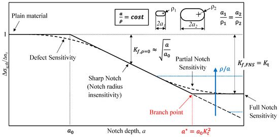 A schematic of the Atzori–Lazzarin–Meneghetti (ALM) diagram is shown in Figure 4 for the case of notches having a null opening angle (2α = 0). The key advantage of this diagram is its ability to simultaneously describe notch sensitivity and defect sensitivity, by considering both the size effect (a) and the notch acuity effect (a/ρ). Specifically, it identifies three distinct regions (see Figure 4): one of complete notch insensitivity, with a < a0, where a0 is the length parameter, first proposed by El Haddad et al. [15]; a second region of complete insensitivity to the notch tip fillet radius for a0 < a < a*; and a region of full notch sensitivity for a > a*. In particular, for a < a0, the notches/defects are so small that they do not affect the fatigue limit of the component Δσg,th, which equals the fatigue limit of the defect-free plain material Δσ0. Conversely, for a0 < a < a*, the notch is so sharp (i.e., the fillet radius ρ is so small) that it behaves as a crack of the same size. In this case, the fatigue limit of the notched component is governed by Linear Elastic Fracture Mechanics (LEFM), and the fatigue limit knock-down factor Kf = Δσ0/Δσg,th is given as follows: