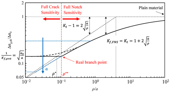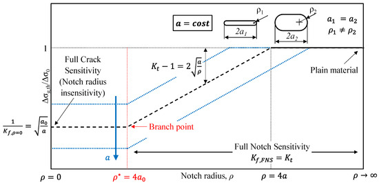 Despite the validity of this diagram, its application to the specific case of a stop-hole geometry may not be straightforward due to the implicit dependence on the fillet radius ρ. Figure 5 presents a different diagram, inspired by the one proposed by Zappalorto [16] for evaluating notch sensitivity under static loadings, which is better suited to illustrate the effect of ρ on the fatigue limit of a notched component, Δσg,th. Such diagram describes the fatigue limit as a function of ρ, while keeping the notch depth, a, constant (Figure 5). The new diagram distinguishes between two different regions: one of complete insensitivity to the notch tip radius when ρ < ρ*, and one of full notch sensitivity (FNS) for ρ > ρ*. Specifically, for ρ < ρ*, the fillet radius, ρ, is so small that the notch behaves as if it is sharp (ρ = 0 → ), while for ρ > ρ*, FNS and classical notch mechanics apply (Kf,FNS = Kt). In the FNS region (on the right side of the diagram in Figure 5), the value of Kt can be represented by a line with a slope of 0.5 in a double-logarithmic plot. This line has been dashed because it represents only a simplifying hypothesis valid only for sharp notches, as will be better explained later. In this case, for ρ > 4a, the notch is so blunt (with Kt being small) that it approaches the case of a smooth specimen without notches (Kf,FNS = Kt → 1). Additionally, as the notch size, a, increases (see the dashed blue lines in Figure 5), the diagram shifts downward, maintaining the fillet radius value at the branch point (ρ* is a material property, independent of absolute dimensions), but delaying the intersection with the smooth specimen asymptote.