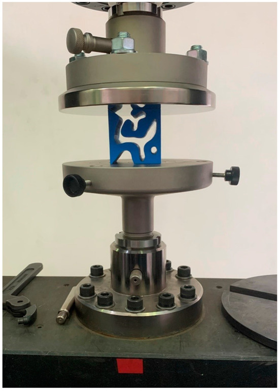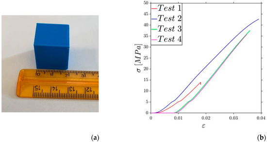 In order to assess the accuracy of the results arising from the FE simulations, static flat compression tests have been conducted in a compression machine equipped with a pair of compression plates. Prior to examining the mechanical response of the metamaterial sample, the printing material (PLA) has been characterized. For this purpose, a compression test has been performed on a cube with a volume of 8 cm3 (Figure 3a). According to the stress–strain curve resulting from this testing (Figure 3b), Young’s modulus of PLA is equal to 1.57 GPa.