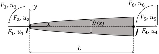 As a reference, consider the beam shown in Figure 2, with length , variable height , and subject to forces and moments at the end-nodes.