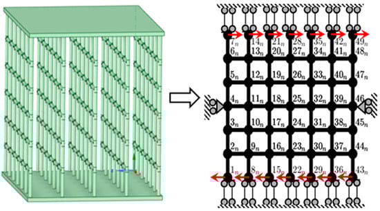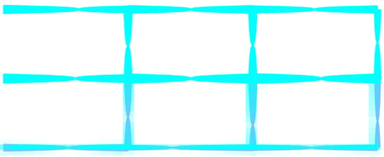 - Layout optimization [], which focuses on the optimal positioning of beams within the frame structure. In this case, the objective is to find the best configuration of members, i.e., nodes’ location, that minimizes stresses while maintaining the desired structural performance.