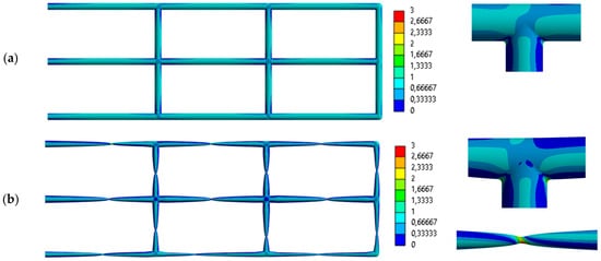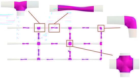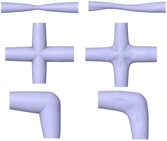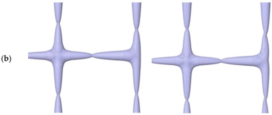 In order to solve problems at the edges where the Timoshenko beam theory is not valid, and thus to achieve an optimized 3D geometry, the BGM was used. The BGM was only applied in the critical zones, i.e., zones of striction and junction between several elements. The following image compares the geometry of step 1 and the final geometry obtained with the BGM. It is emphasized that the BGM is an iterative method, so in each step, the mesh is updated according to the measured surface tension. It is evident, therefore, how starting from an already-optimized geometry and intervening only in certain areas allows the time required for optimization to be considerably reduced. Figure 11 and Figure 12 show a comparison of step1 and step2 optimized geometries.