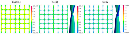To compare the results, the nodal values of f1 and the scalar values of factors f1, f2 and f3 were analyzed. The f1 contour plots (Figure 21) show a significant improvement in material utilization from the baseline to step 1, with some problem areas fully resolved in step 2. A closer look at the scalar values in Table 3 and Table 4 reveals a substantial reduction in both and , accompanied by a significant decrease in weight. The energy factor also improves considerably, thanks to the combined effect of volume reduction and increased deformation energy.