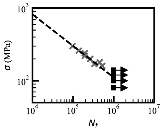 SL tests provided a more direct assessment of the fatigue limit, as shown in Figure 5a. The iterative method applied to SL test data at 15 Hz identified a noticeable knee in the curve around 150 MPa, consistent with the fatigue limit observed in the CAL tests.