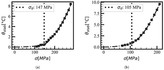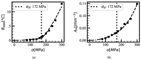 Figure 4a presents the stabilized surface temperature increment versus stress amplitude for the CAL series. The fitted curve shows a clear bi-power law behavior, particularly for stresses below the fatigue limit. This behavior is consistent with expectations for bulk materials and aligns with observations in the literature [16,17].