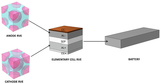 Two-step homogenization: the heterogeneous structure of the composite electrode is homogenized inside the unit cell RVE. Then, the unit cell is homogenized at the battery level.